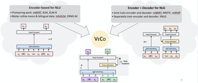 VECO 效果亮眼,主要是因为两项创新:一是其可以更加“显式”得进行跨语言信息的建模(图1);二是 VECO 在预训练的过程充分学习用于语言理解(NLU)和生成(NLG)任务,并让二者互相学习提高彼此(图2)。因此,VECO 模型成为了多语言领域内的第一个同时在多语言理解(NLU)和语言生成(NLG)任务上均取得业内最佳效果的模型,也被顶会 ACL2021 录用。