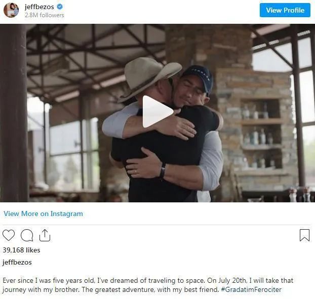 “从五岁开始,我就梦想着去太空旅行。7月20日,我将和我的兄弟一起开始这段旅行。最伟大的冒险,和我最好的朋友。”