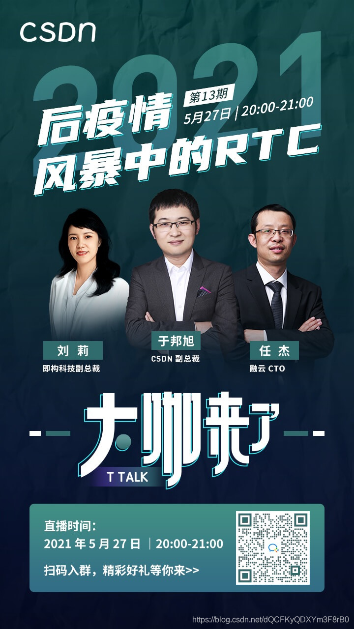 5月27日20点,第 13 期「大咖来了」! CSDN 副总裁于邦旭、融云 CTO 任杰、即构科技副总裁刘莉,多方视角探讨 RTC 超级风口与机遇,还有众多精美礼品等你拿! 立即戳:https://live.csdn.net/room/csdnnews/cn…