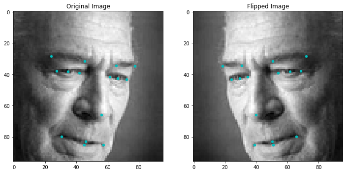 水平翻转—这是相对简单的。图像的x值和关键点反映在图像的中心。对应于脸部左侧的关键点被替换为相应的右关键点。这使训练数据增加了一倍。以下是水平翻转的示例。