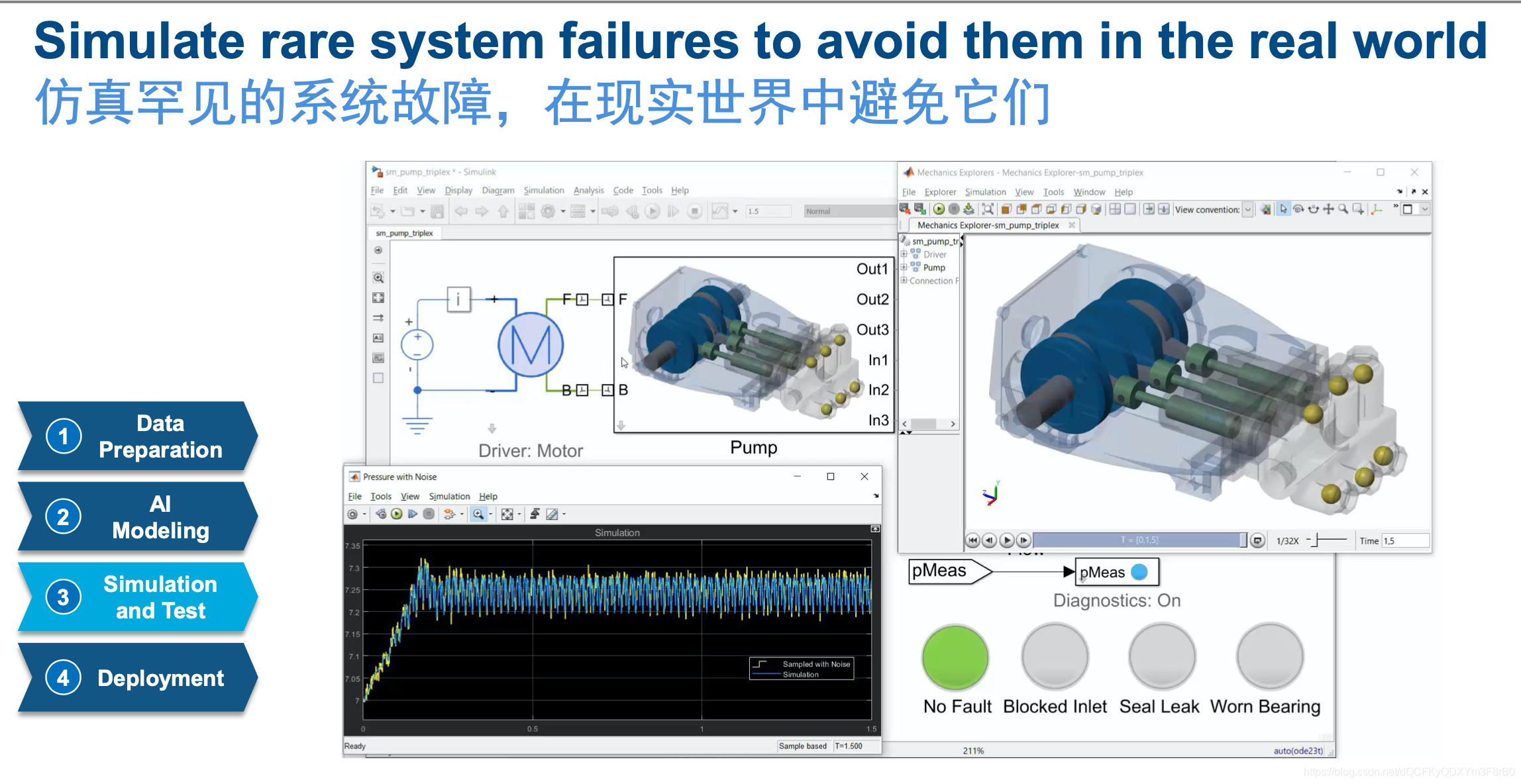 此外,Simulink 还可以生成已知故障工况的故障数据。例如在风力发电厂中,开发者可以将合成故障数据添加到风力发电机测得的真实数据中,就可以优化系统模型,以获得准确的未来设备故障预测器。