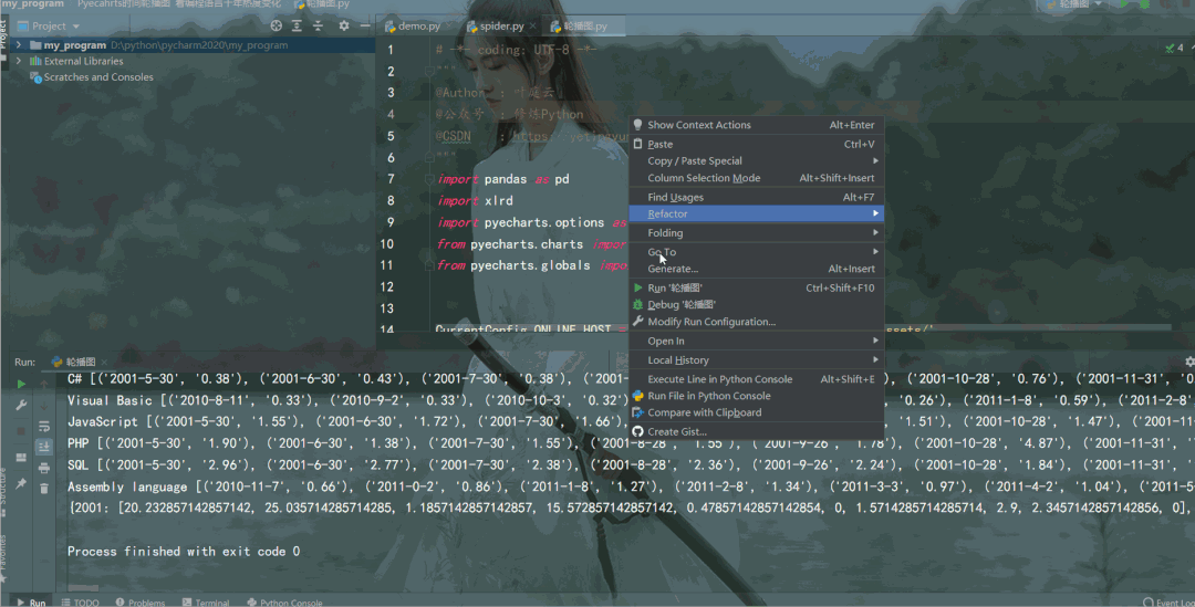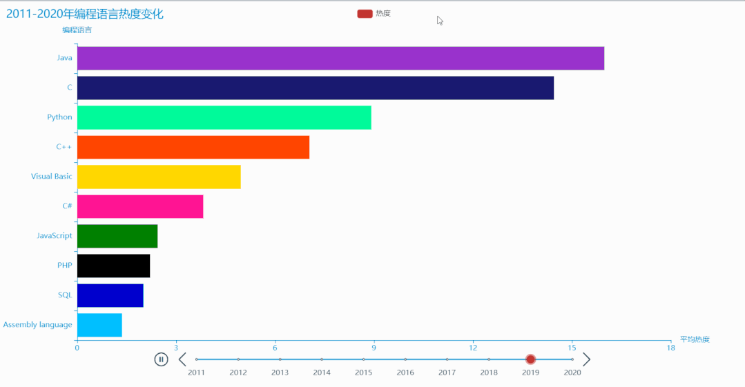利用 pyecharts 绘制时间轮播图数据可视化,展示现在热度排 Top10 的编程语言 2011-2020 年这十年里平均热度变化。