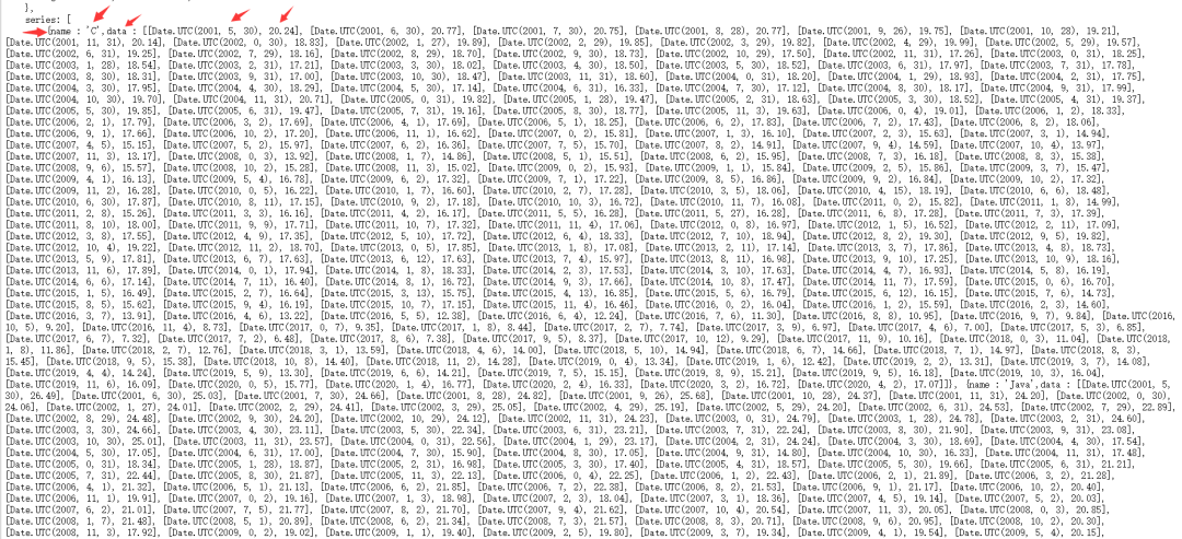 36 data_per[int(j[0][:4])][count].append(eval(j[1])) # 一年里各编程语言不同时间时的热度 对应