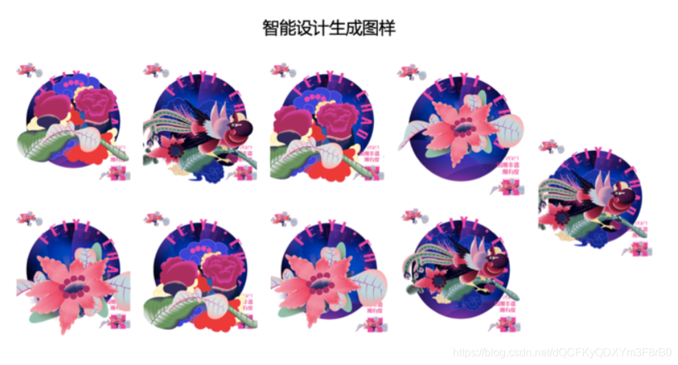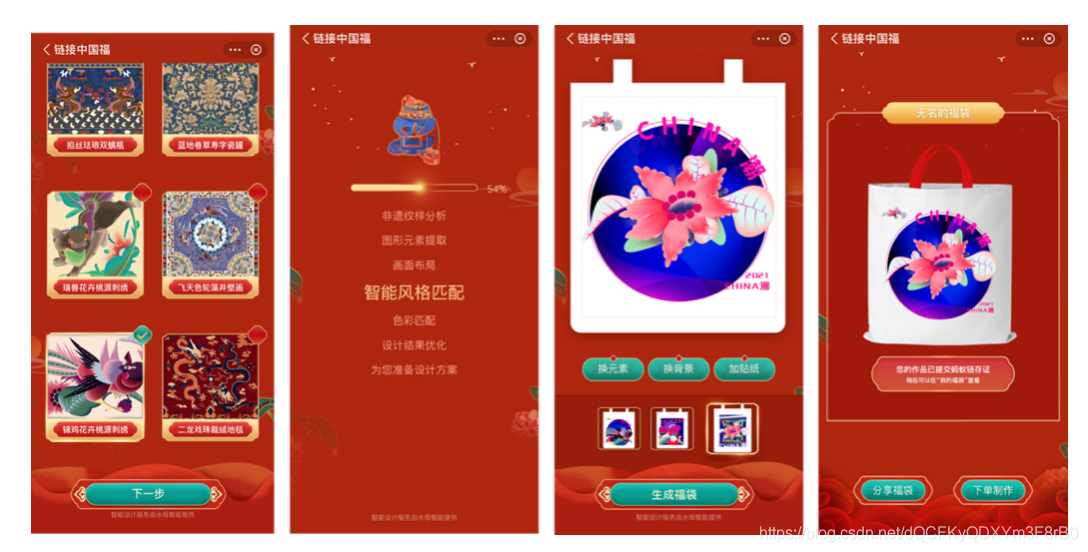 通过智能设计,会先快速完成原始纹样分析和图形元素提取。例如基于《锦上添花》,机器会拆分出来三个主型图案:花束、单个花朵、锦鸡。在此基础上通过智能风格匹配不同的背景和色彩,在后台生成多组设计方案,并将优化后的设计方案推荐到用户端前台展示页面。而这一系列的动作,只需在10秒内即可完成。活动上线两天已经有超过39万人体验,用智能设计做专属福袋了~