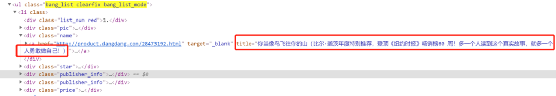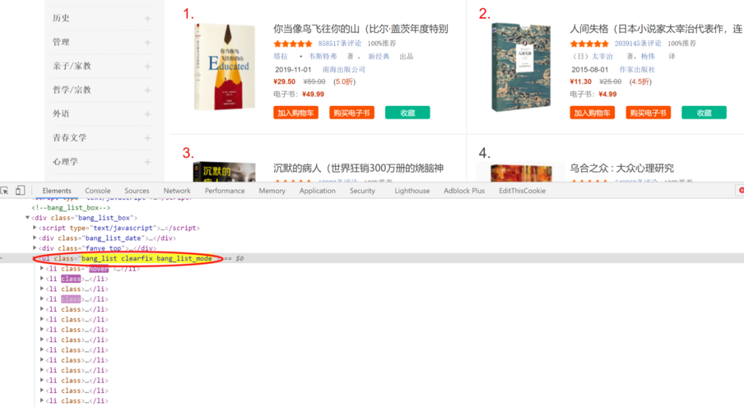 审查网页元素后可以发现,书目信息都包含在 li 中,从属于 class 为 bang_list clearfix bang_list_mode 的 ul 中。