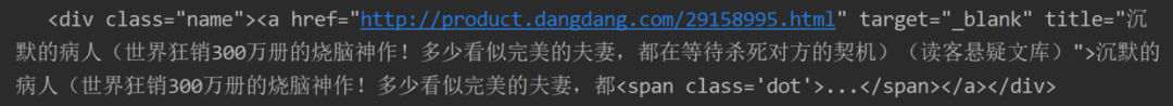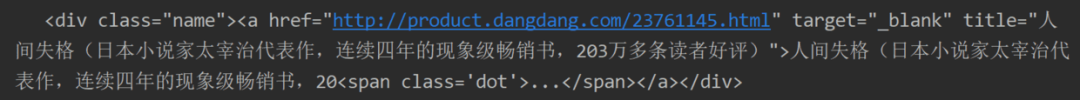 print(response)观察几个数目相信就有答案了:<div class="name"><a href="http://product.dangdang.com/xxxxxxxx.html" target="_blank" title="xxxxxxx">书名就藏在上面的字符串中,蕴含的网址链接中末尾的数字会随着书名而改变。