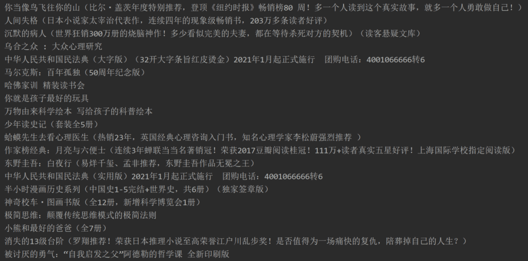 response = requests.get(url).textdef bs_for_parse(response):soup = BeautifulSoup(response, "lxml")li_list = soup.find('ul', class_='bang_list clearfix bang_list_mode').find_all('li') # 锁定ul后获取20个lifor li in li_list:title = li.find('div', class_='name').find('a')['title'] # 逐个解析获取书名print(title)if __name__ == '__main__':bs_for_parse(response)成功获取了 20 个书名,有些书面显得冗长可以通过正则或者其他字符串方法处理,本文不作详细介绍。