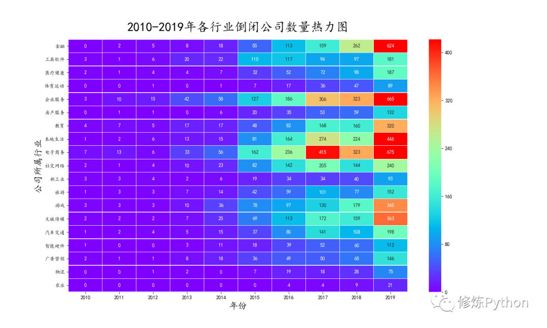 43ax.set_title('2010-2019年各行业倒闭公司数量热力图', fontsize=25, x=0.5, y=1.02)