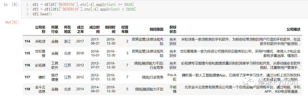 2df1 = df[df['倒闭时间'].str[:4].apply(int) >= 2010]