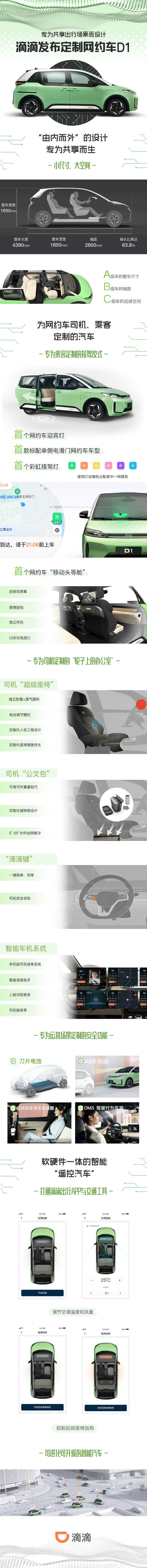 对乘客来说,D1是一款“可遥控”的网约车。乘客上车前可以通过滴滴App调节车内空调温度、风量等。当乘客呼叫D1时,平台会派发一个彩虹颜色与迎驾车辆匹配,“彩虹接驾灯”让乘客更方便找车。D1的单侧电滑门让上下车体验更好。在安全方面,D1搭载了AEB系统,急行遇障时会自动刹车,保障司乘安全。这是在同档车中首次采用AEB系统,也是首款搭载AEB系统的网约车。