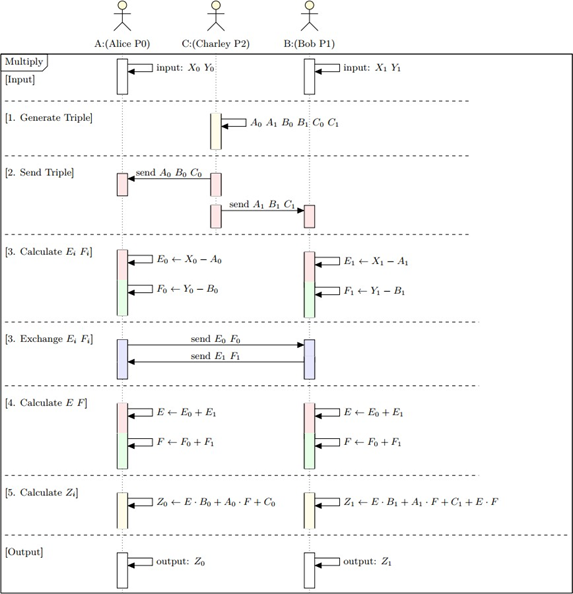 乘法相对较为复杂,我们结合经典的 Beaver Triple 方法[2]加以介绍。该方法是由密码学家 Donald Beaver在 1991 年提出,主要思想是通过乘法。协议基本原理如下: