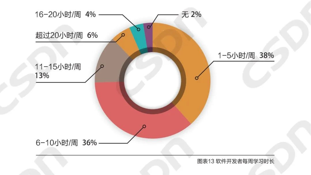 38%的开发者每周学习1-5小时,59%的开发者每周学习6小时以上。