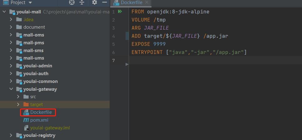 显然官方推荐的是 dockerfile-maven 这种依赖Dockerfile的方式,但是在部署 youlai-mall 项目使用 docker-maven-plugin 只要配置好 pom.xml 便无需修改外置配置了,所以更为方便省心,下面就这两种方式如何实现镜像构造进行逐一说明。其中统一以 youlai-mall 的 youlai-gateway 网关模块进行构建。