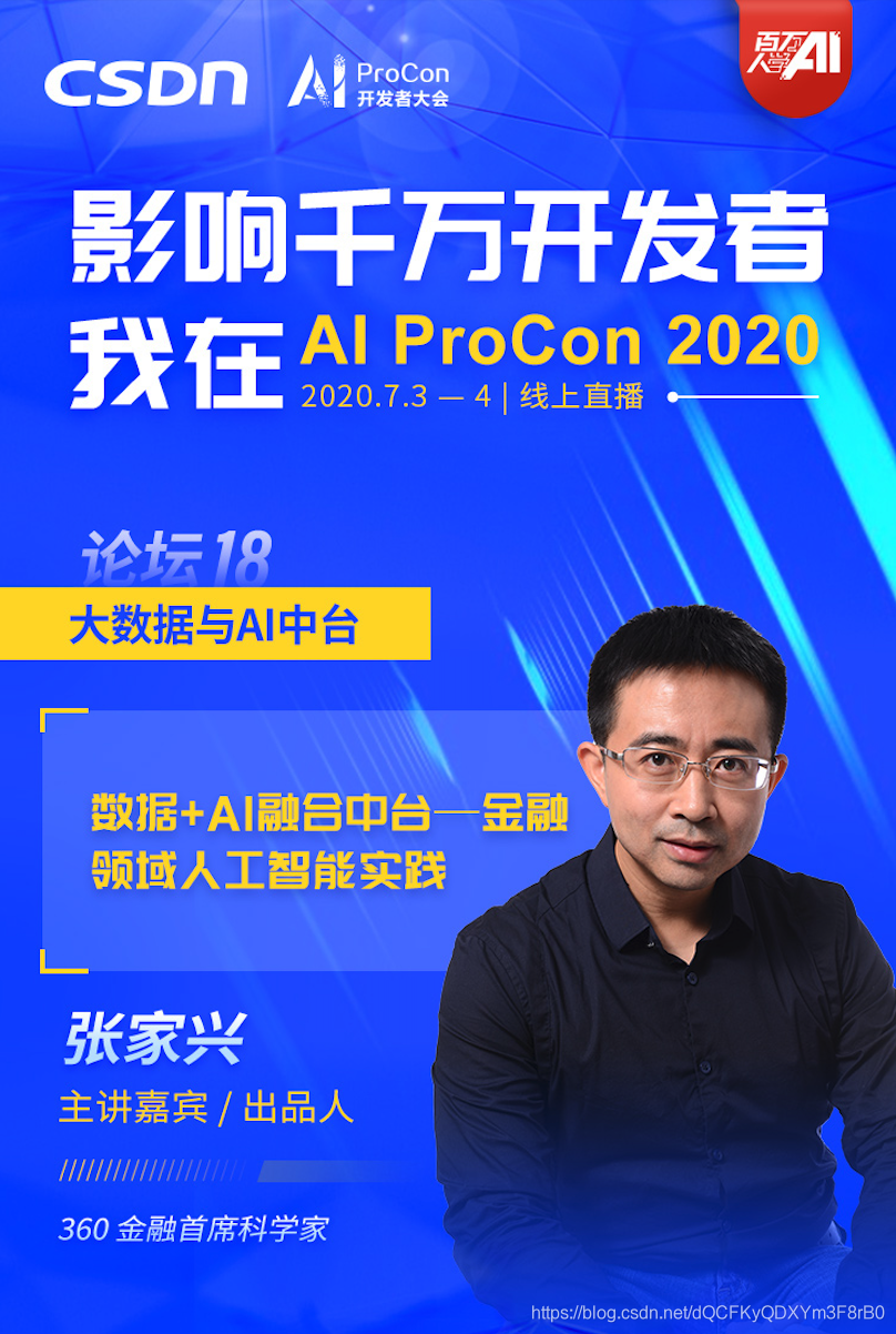 2020年7月3—4日,在CSDN 主办的第三届 AI 开发者万人大会(AI ProCon 2020)上。360金融首席科学家张家兴博士以“数据AI融合中台——金融领域人工智能实践”为题,揭秘了360金融在金融科技领域的前沿技术理念与实践心得。 张家兴认…