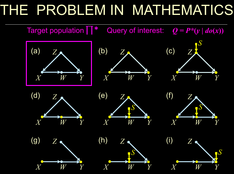 第一个输出是较难理解的,如果已有模型假定下某 Query 无法回答,也就是没有对应的 Estimand,则称该 Query 为“不可识别”,Pearl 的 do-calculus 就是判断 Query 是否可识别的一个完备的演算工具。Pearl 仅用抽象的方式描述了这个推理引擎,关于该引擎如何回答因果问题,如何解决数据科学中的混杂偏差,选择偏差和迁移学习问题的细节可以参考 Elia Bareinboim 的论文[7]。