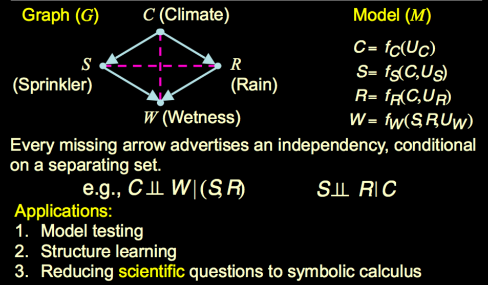 他指出第一个定律是关于反事实的信息,可以推演出需要使用函数来刻画变量之间的因果关系,而第二个定律刻画了因果图结构,因果图上每个每条缺失的边都意味着在给定某些变量下的条件独立性,可用它做模型检验,结构学习和因果问题的符号演算。他以这两大基本定律为出发点,发展出了被称为结构因果模型(SCM)的数学框架,该框架能够回答三个层级的因果问题。在如下的例子中,模型用函数关系表示,而因果图上的缺失的边 CW 和 SR 都意味着给定某些变量之下的条件独立性。