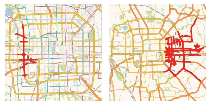 实验数据集分别记作W3-715和E5-2907,分别对应西三环附近的715个路段和东五环附近的2907个路段(如图 7 所示)。数据集的时间跨度为2018年12月24日至2019年4月21日(其中包含的节假日被移除,共十周数据),保留的时段为每天的06:00至22:00。前八周数据作为训练集,后两周作为测试集。