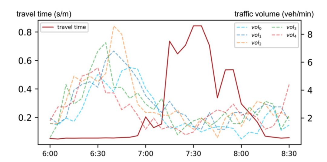 为解决这一问题,我们从高德导航引擎中获取了“计划中交通流量”(intended traffic volume),并将其扩充到机器学习模型当中。计划中交通流量来自导航数据,反映了用户出行意图中蕴含的未来交通流量。由于拥有海量用户,高德地图中的导航规划数据能够较为全面地反应正在发生的通行需求,并且信息粒度较事件级别的特征更精细。具体来说,规划的路线产生了计划中交通流量,而计划中交通流量可以用以指导对未来通行时间的预测。图 1 中,volf代表当前可获取的导航路径在f个时间步后在此路段产生的计划中交通流量。计划中交通流量的迅速飙升意味着即将到来的交通拥堵。