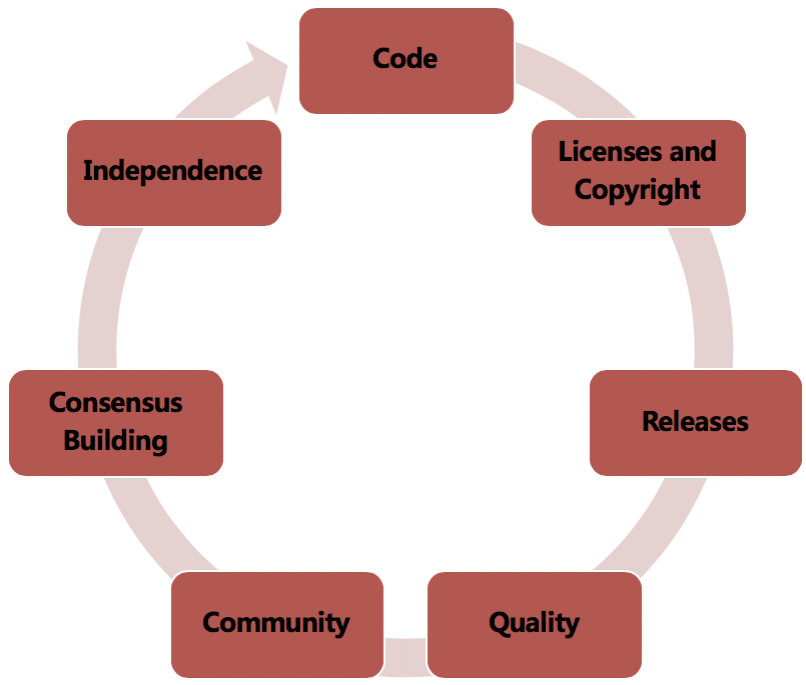 依据 Apache 的成熟度评估模型图 1-5,在以下几个方面评估社区和项目是否成熟。其实在 Apache 项目社区的初建阶段,我们建议大家就在这几个方面发力,因为这是官方给予的毕业标准及指导方针。以此为方向,探索属于各自项目的独特社区运作方式,也可谓是百花齐放。