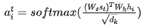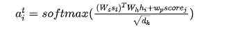 其中 是解码器时刻的隐层状态, 是编码器第个输入对应的隐层状态, 为隐层状态维度。