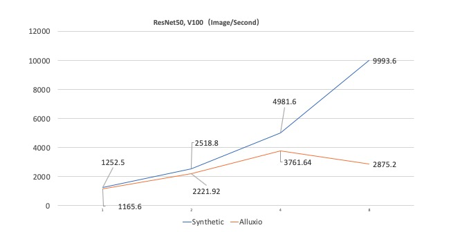 下图是在分别在生成数据(Synthetic Data)和使用 Alluxio 缓存的性能对比,横轴表示 GPU 的数量,纵轴表示每秒钟处理的图片数。生成数据指训练程序读取的数据由程序自身产生,没有 I/O 开销,代表模型训练性能的理论上限; 使用 Alluxio 缓存指训练程序读取的数据来自于 Alluxio 系统。