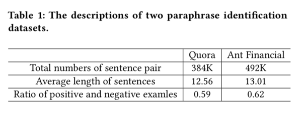 我们选择 Quora Question Pair 和 Ant Financial 这两个比较句子相似性的公开数据集,数据集的介绍如 Table 1 所示。