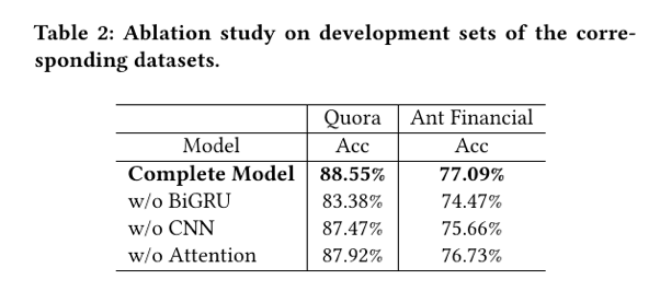 从消融分析的结果可以看出,去掉 BiGRU 对应结果的影响是最大的,说明了使用 BiGRU 对文本进行建模是有效并且必要的;去掉 CNN 的影响其次,说明 CNN 的加入,可以在某些方面弥补 BiGRU 的不足。从前 2 个消融分析的实验可以看出,单独使用 BiGRU 和单独使用 CNN 的效果和同时使用 BiGRU 和 CNN 有较大差距,说明了我们在 Input Encoding 和 Interaction Modeling 阶段引入 BiGRU 和 CNN 的做法是 work 的。