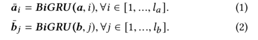 首先,对待比较的 2 个问题文本使用 BiGRU 进行编码,主要为了捕捉句子序列的特征信息。这里没有使用 ESIM 中的 BiLSTM,因为在实际应用中发现使用 BiGRU 的效果更好,同时效率更高。
