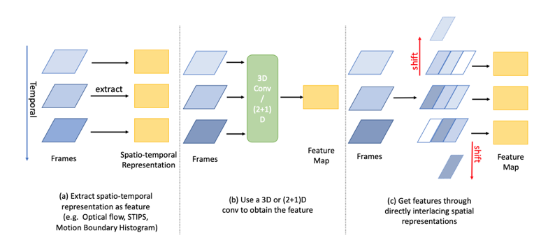 本文提出了一个简单而强大的模块-时序交错网络(Temporal Interlace Network)来尝试解决这个问题。TIN不学习时间特征,而是通过交错过去到未来以及未来到过去的空间特征来融合时-空信息。一个可微分的子模块可以计算出交错时的特征在时序维度上的偏移量,同时可以依据偏移量来将特征重新进行交错排列,使每组特征在时间维度上位移不同的距离。从而用便捷快速的特征位移操作替代了3D卷积来实现相邻帧的信息交换。这使网络的参数量和计算量远低于普通3D卷积网络,使网络整体变得相当轻量化。在文中我们也从理论上证明了可学习的时序交错模块本质上等同于受约束的时序卷积网络。