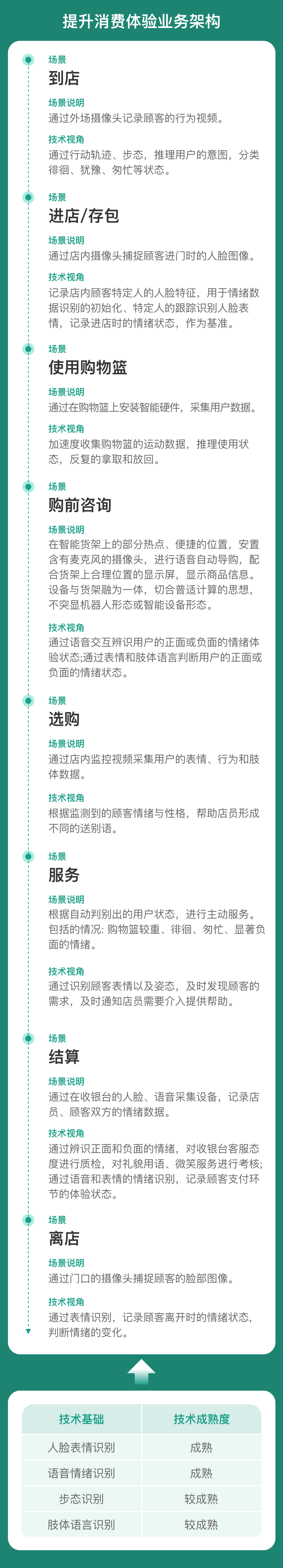 因此,可以看出情感计算主要是采用卷积神经网络和NLP技术来识别情绪,在驾驶、零售、教育等行业的应用较为成熟。其中,在零售行业中的应用场景较为丰富,包括:消费者购物体验提升、店员服务质量提升、广告优化、智能客服等场景。
