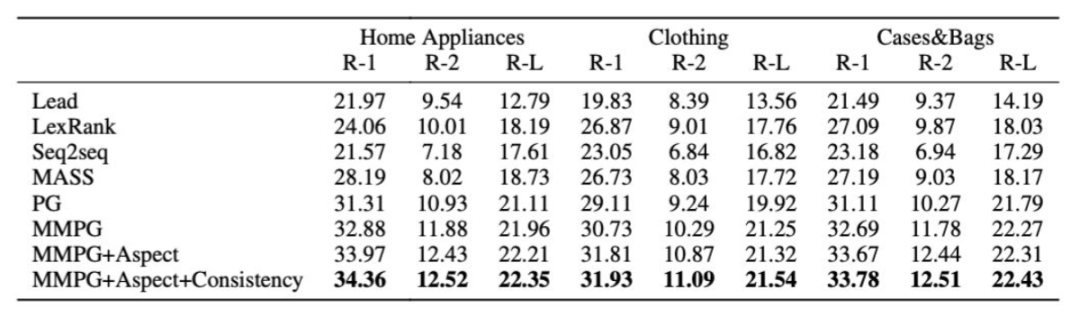 如表1所示,本文提出的带有的多模态商品摘要模型,MMPG模型取得了比所有基于纯文本的模型更好的结果,这证明了商品视觉信息和商品要素信息在商品摘要任务中起着重要的作用。