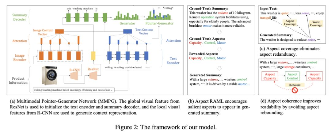 与传统的文本摘要任务相比,商品摘要任务更具挑战性。一方面,商品给顾客的第一印象来自该商品的外观,这对顾客的购买决策有着至关重要的影响。因此,商品摘要系统必须能够充分挖掘商品视觉信息,反映商品的外观特色。另一方面,不同的产品有不同的卖点。例如,紧凑型冰箱的优点是节省空间,而环保型冰箱的优点是节能。因此,商品摘要应该反映商品最独特的方面,从而最大限度地促成消费者的购买。