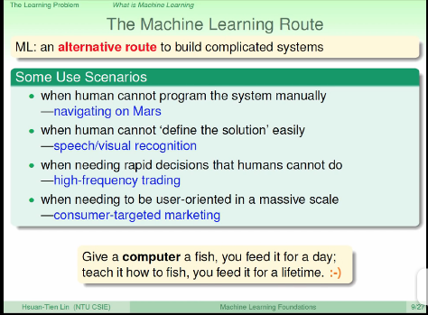 机器学习要做的事情,是类似于教电脑钓鱼的方法,让它可以一辈子受用。