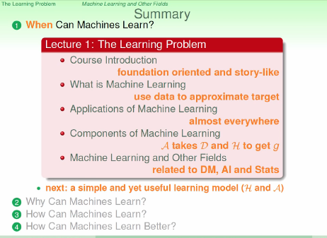 本节课主要引入了机器学习的概念,机器学习实际上是从资料出发找到一个函数,然后找到的函数和我们最渴望的目标是很接近的。机器学习在很多地方都有应用,其核心 算法,数据(资料),假说(hypothesis)最后得到g。