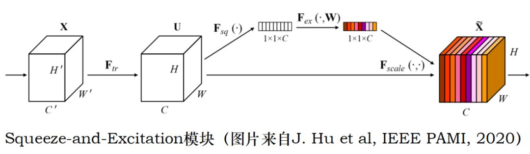 如下图所示,SENet 通过一个小型网络学习得到一组权值系数,用于各个特征通道的加权。这其实是一种注意力机制:首先评估各个特征通道的重要程度,然后根据其重要程度赋予各个特征通道合适的权重。