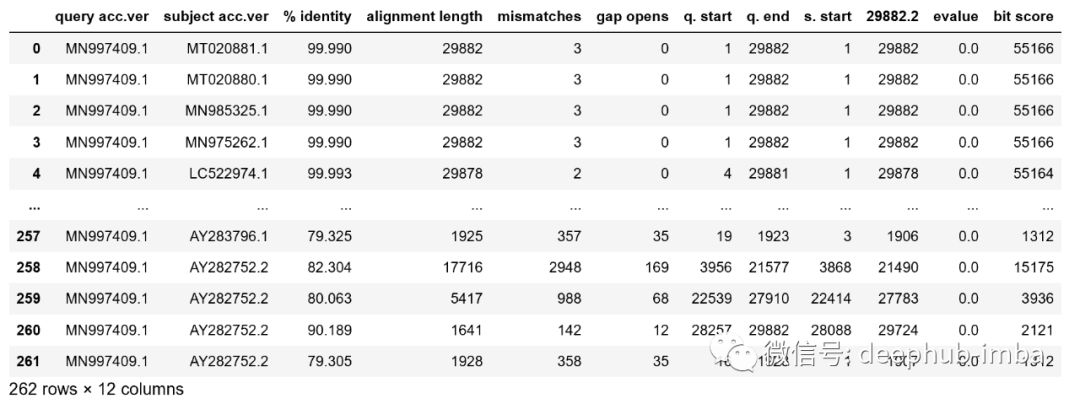 query acc.ver代表原始病毒标识符。subject acc.ver是病毒突变的标识符。% identity代表当前序列与原始病毒相同的百分比。alignment length表示序列中有多少个相同的标识符。mismatches代表突变和原始变异的数量。bit score表示衡量对齐程度的度量;分数越高,对齐越好。每列的一些统计度量(可以在Python中使用