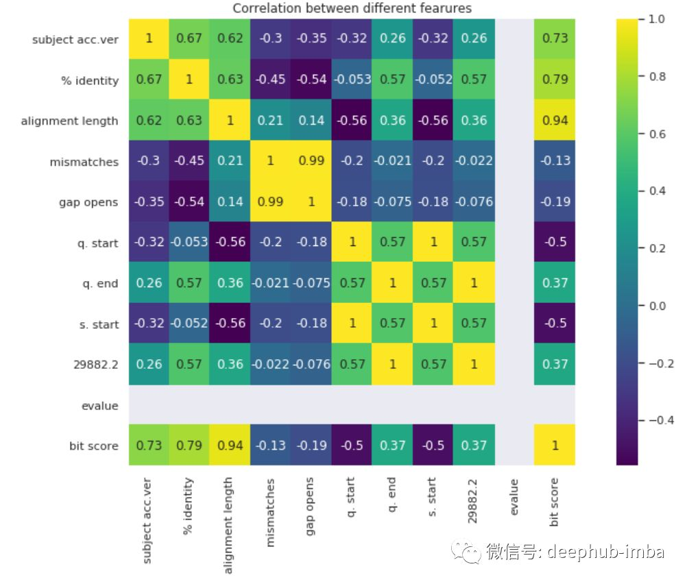 图中可以看到许多数据彼此高度相关。这是有道理的,因为大多数突变都是彼此不同的。需要注意的一件事是alignment length与bit score高度相关。