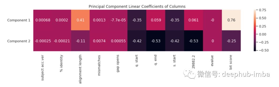 每个新功能(主要组件)都是其他几列的线性组合。我们可以通过热图可视化其中一列对于相对的两个其他组件之一的重要性。
