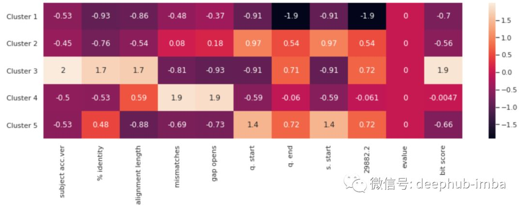 此热图按列表示每个簇的属性。因为这些点是按比例缩放的,所以图中标注的数值在数量上没有任何意义。但是,可以比较每列中的标注值。您可以从视觉上了解每个突变簇的相对属性。如果科学家要开发疫苗,它应针对这些主要的病毒突变簇。