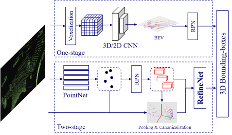 2)两阶段检测器 (two-stage): 首先用PointNet提取点级特征, 并利用候选区域池化点云 (Pooling from point cloud) 以获得精细特征. 通常能达到很高的精度但速度很慢。