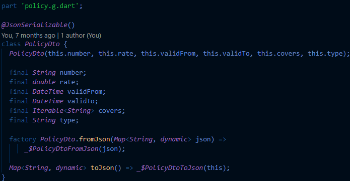 可以看到,get()函数标记为async,意思是它的返回值会包裹在Future<>中,采用类似于promise的处理方式。http客户端会异步执行命令,然后提供响应结果、状态码等。紧接着我们将JSON(其类型默认为Map<String, dynamic>)映射为DTO对象。由于这些是字典,所以我为它们创建了map,这样就不需要在显示某个代码对应的名称时遍历所有元素了(只需这样写即可:commonData.maps[DictCode.PRODUCT_TYPE][_policy.type])。