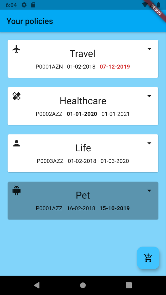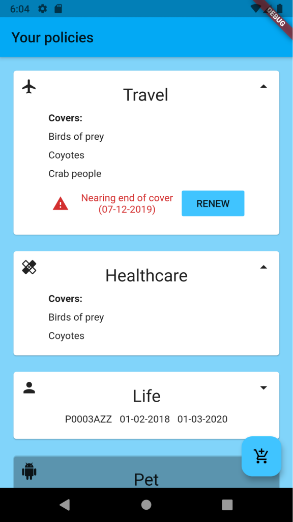 主页基本上就是一个列表,里面展示了每个保单,每个列表项可以展开显示保单的详细信息,另外还有一个创建新保单的选项。因此,每个列表项应该是有状态的,因为列表项的外观会发生变化大,但是整个页面可以是无状态的。主页显示了一个可变长度的列表,但是在其生命周期内,其中的元素和值不会发生变化。请注意,如果我们没有将每个列表项分成独立的小部件(而是在一个类中处理所有内容),那么页面就必须是有状态的。
