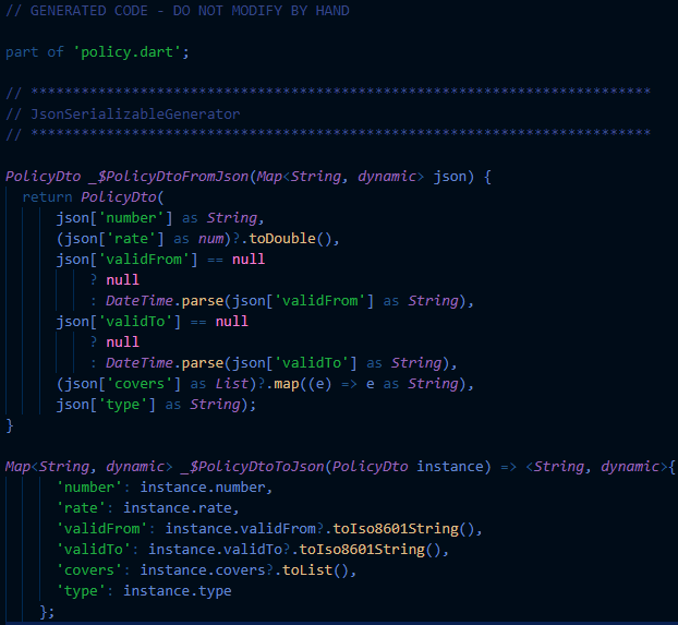 接下来看看DTO。将json转成对象并没有公认的方法,但幸运的是我们可以利用很多插件。我这里使用了json_annotation(https://pub.dev/packages/json_annotation),用它来监视启动后(flutter packages pub run build_runner watch)就会寻找 @JsonSerializable标记并创建映射函数,如图12~13所示。
