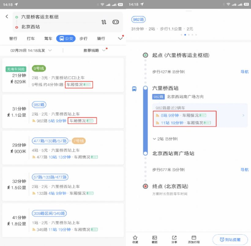 而在“地铁/公交客流量查询”中,北京的用户只需输入目的地并选择“公交”出行一栏后,在路线结果页即可查看前往该地的地铁、公交客流量。点击任意一条路线后,详情页中还将显示最近一班车次、下一班车次的客流量。