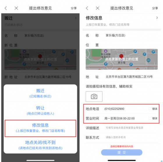 除了AI打电话之外,百度地图还会对所搜集信息进行人工复核,并鼓励用户积极上报信息,若用户发现身边商户的营业情况与现实不同,可以点击“上报-地点报错”,选择已复工的店铺并点击修改信息提交即可,这也进一步确保了复工信息的实时性和准确性。