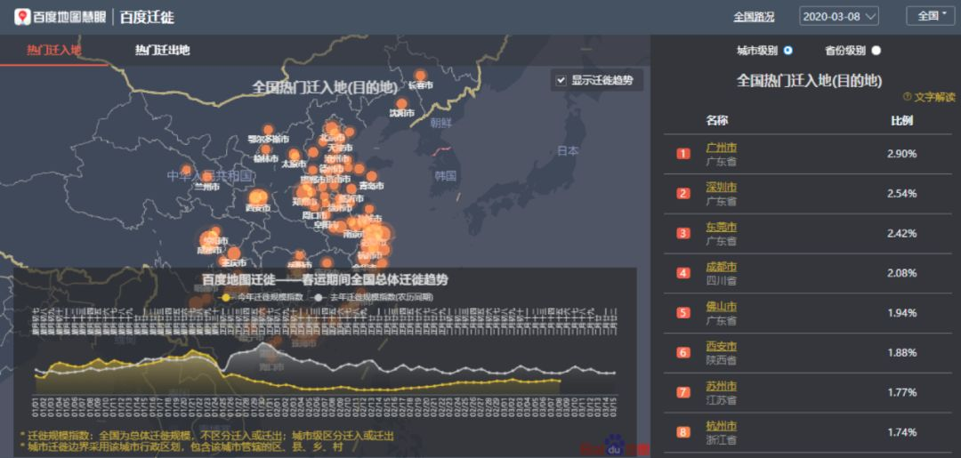 对于大家普遍关心的春运和回城迁徙的问题,百度地图的迁徙大数据平台推出了春运期间全国总体迁徙趋势和城内出行强度趋势等查询功能。从特定城市出行强度趋势,到迁徙规模指数、迁出目的地及迁入来源地等数据都有覆盖。为公众、媒体、政府、科研单位提供了全面、立体的数据支持与服务。
