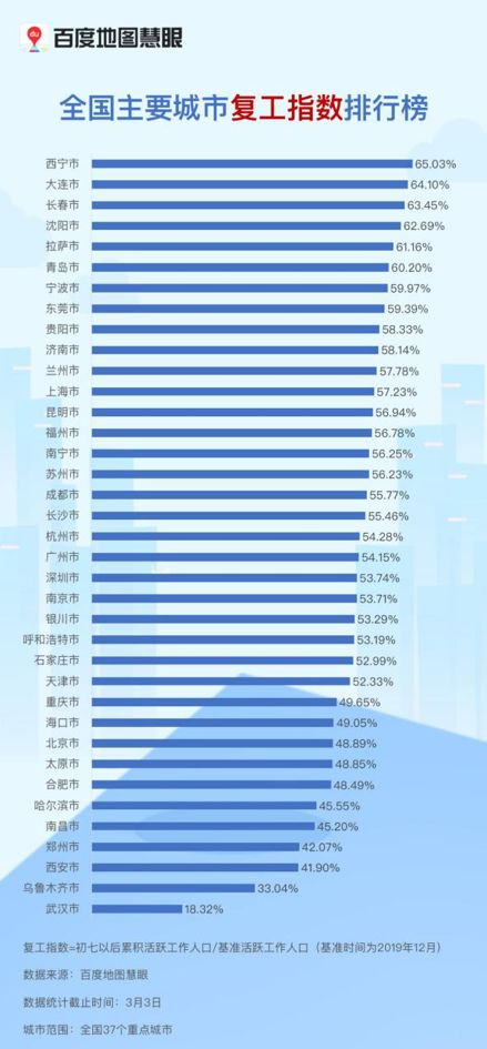 为了让公众、媒体和政府有关部门及时了解所关注区域的复工进度及趋势。在复工地图的基础上,百度地图慧眼通过时空大数据及AI相关技术,以周为单位发布“城市复工指数”。通过正月初七后累积活跃工作人口与基准活跃工作人口(基准时间为2019年12月)的比值,可以度量出城市复工进度。