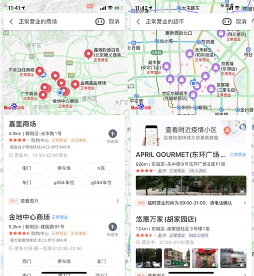 此外,直接在百度地图主页搜索框输入“正常营业的商场”、“正常营业的超市”等关键词,也可查看所在地区相关场所的复工情况。