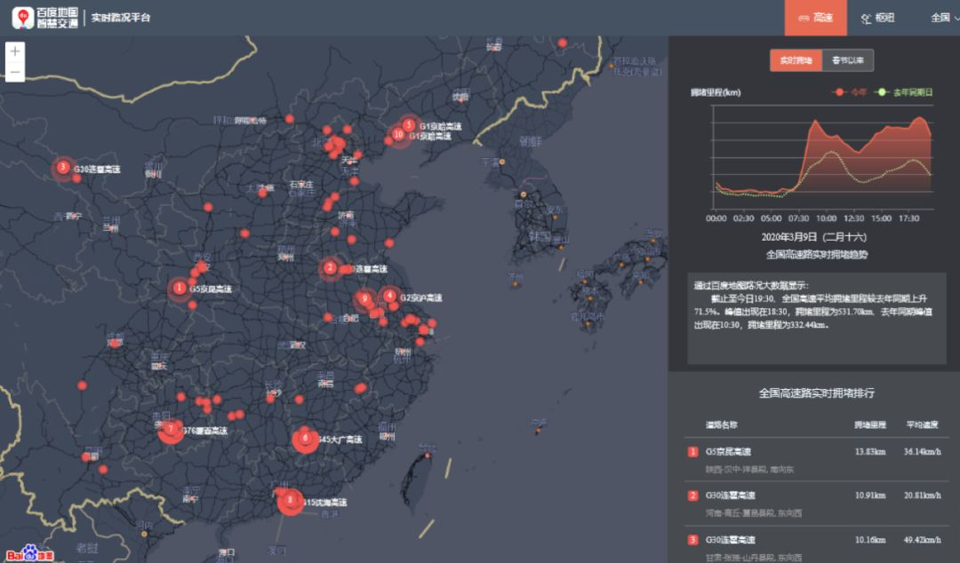 而说到迁徙就不得不提每年春运中的自驾大军了,尤其在疫情期间,避开人流量大的路段和时段,是安全出行的不二选择。为了给自驾出行的朋友及交管部门提供数据参考,百度地图还推出了“实时路况平台”。通过高速拥堵路段展示和拥堵趋势展示功能,帮助自驾一族第一时间掌握路况信息,合理规划自己的行程,最大限度的避免拥堵、降低感染风险。