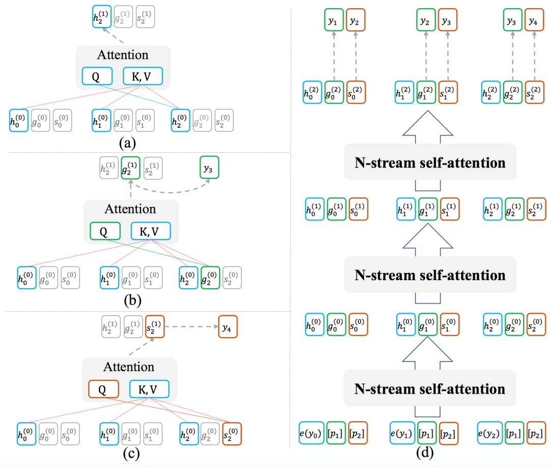 图2:(a) 为main stream self-attention;(b) 为1-st predicting stream self-attention;(c) 为2-nd predicting stream self-attention;(d) 展示了n-stream self-attention的输入输出及流程。